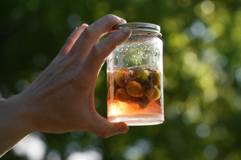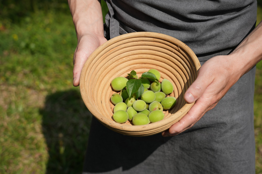 輕輕敲裂青梅,隨著「喀嚓」一聲脆響,清甜香氣瞬間在空氣中瀰漫。將採摘的作物均勻揉入顆粒晶瑩的糖中,翻動糖粒時,香草的精油被緩緩釋放,產生一種層次豐富的獨特清香,最後步驟,一層糖、一層梅層次堆疊,封存春天時光靜待發酵完成。